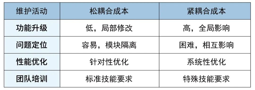 总结: 紧耦合系统通常应用于需要高性能和低延迟的场景。例如在嵌入式系统中,硬件资源有限,模块之间需要频繁、快速地交换数据,因此紧耦合设计可以最大限度地利用硬件资源。企业级应用通常需要频繁更新和维护,通过松耦合设计可以降低系统的复杂性,使得系统的升级和维护更加容易。建议从松耦合开始,逐步向关键模块紧耦合演进。